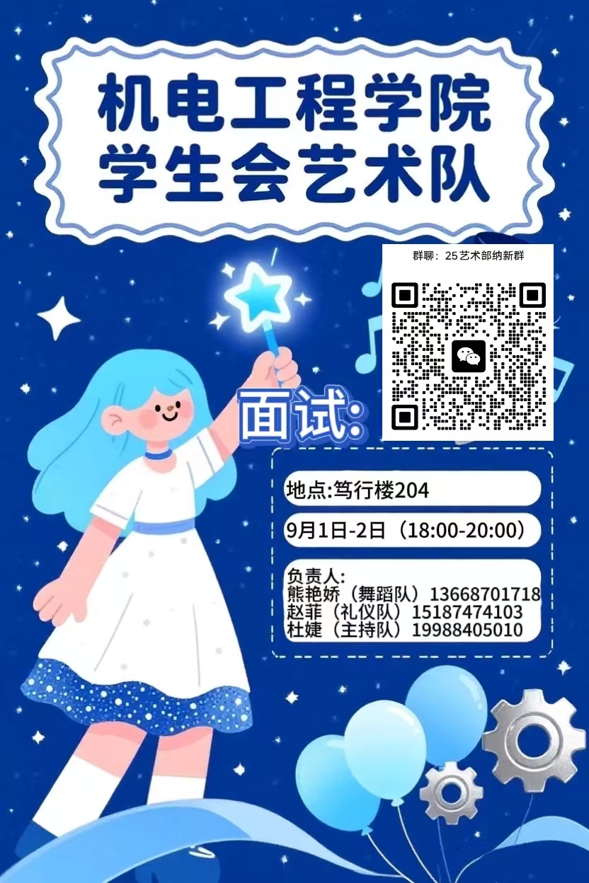 主要职责活动场地申请、现场座次安排、横幅打印、活动PPT制作、水牌打印、邀请函呈送、资料存档、会议通知及布置。加入我们,一起忙在机电!
