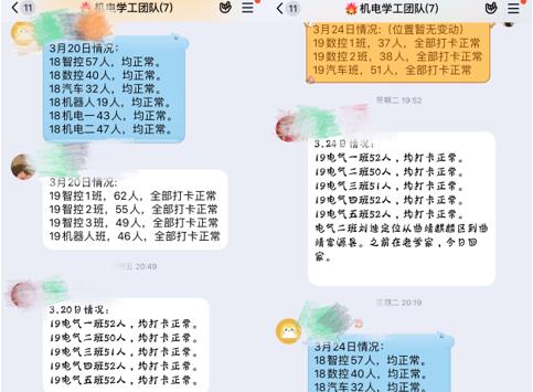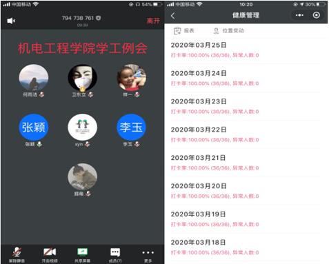 三是学工部门扎牢战“疫”安全墙,健康反馈不松懈。自2月28日起,学院全面启动微信平台“我在校园”师生健康打卡。学院各内设科室积极行动,及时进行师生健康状况全面排查工作。教职工健康打卡率一直保持100%。学工办进行疫情信息“零报告”,每日报备学生身体是否正常、是否返昆等信息,建立起学院健康监督体制、“党总支副书记-辅导员-班主任-班长团支书-舍长”五级人员管理机制。此外,机电学工团队在党总支副书记张颖老师的组织下,定期依托“腾讯会议”平台召开学工例会,讨论疫情期间学生管理工作以及复学前的准备。