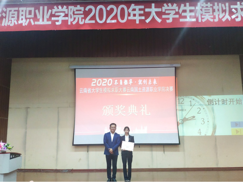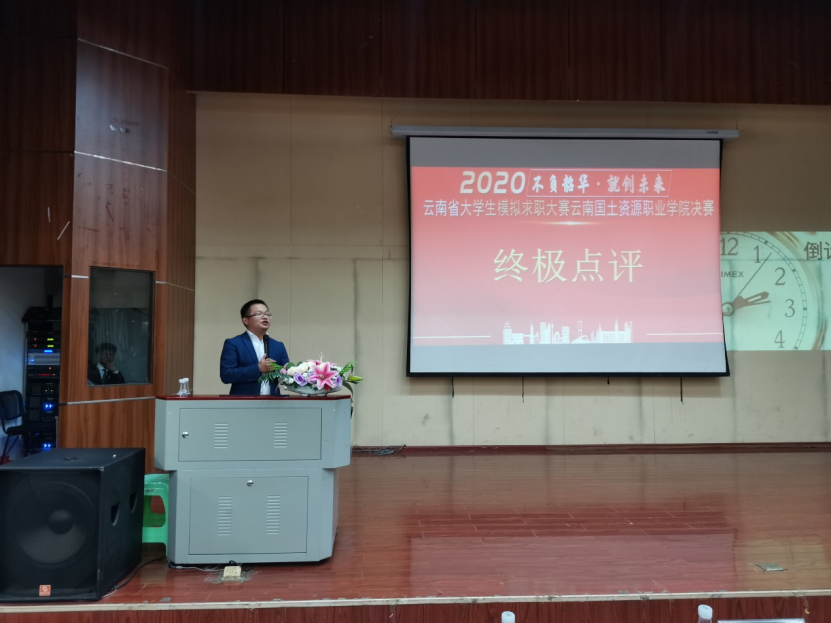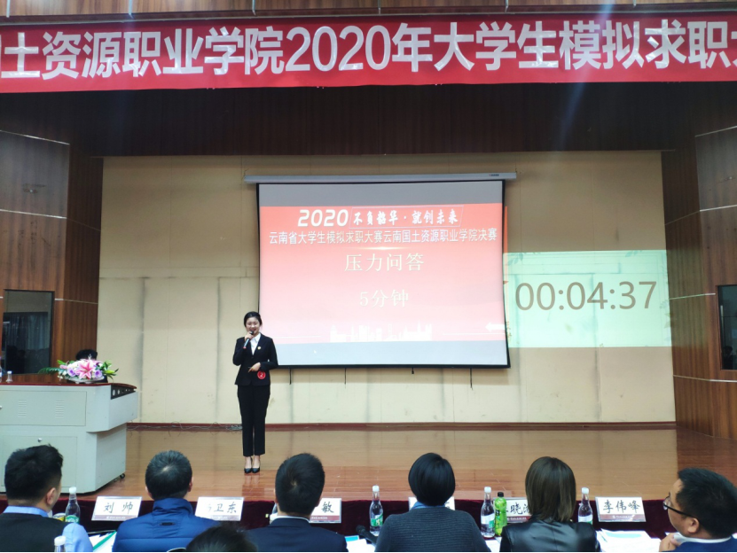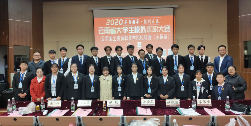 为全力做好我校大学生就业指导工作,加大就业服务工作力度,创新就业指导模式,引导大学生了解用人单位需求,合理进行职业规划,并选拔优秀代表参加省级比赛,云南国土资源职业学院2020年大学生模拟求职大赛(企招组)决赛于2020年11月12日18:30在光荣讲堂进行,本次大赛由澳门十大信誉好的网站承办。出席本次大赛的嘉宾老师有云南国土资源职业学院副院长董钧祥老师、云南国土资源职业学院就业与校企合作处处长董云老师、澳门十大信誉好的网站党总支书记王春莲老师、云南国土资源职业学院就业与校企合作处副处长钱敏老师,担任本次大赛的评委嘉宾有昆明市阳光心霖儿童公社人力资源部总监刘帅老师、昆百大集团人力资源总经理杨卫东老师、昆明怡泰祥有限珠宝公司人力资源总监陈敏老师、昆明合景房地产经纪有限公司人力资源总监任欣茹老师、云南鸿翔一心堂药业(集团)股份有限公司人力资源中心招聘管理部经理杜晓渝老师、麒盛科技股份有限公司人事总监李伟峰老师。