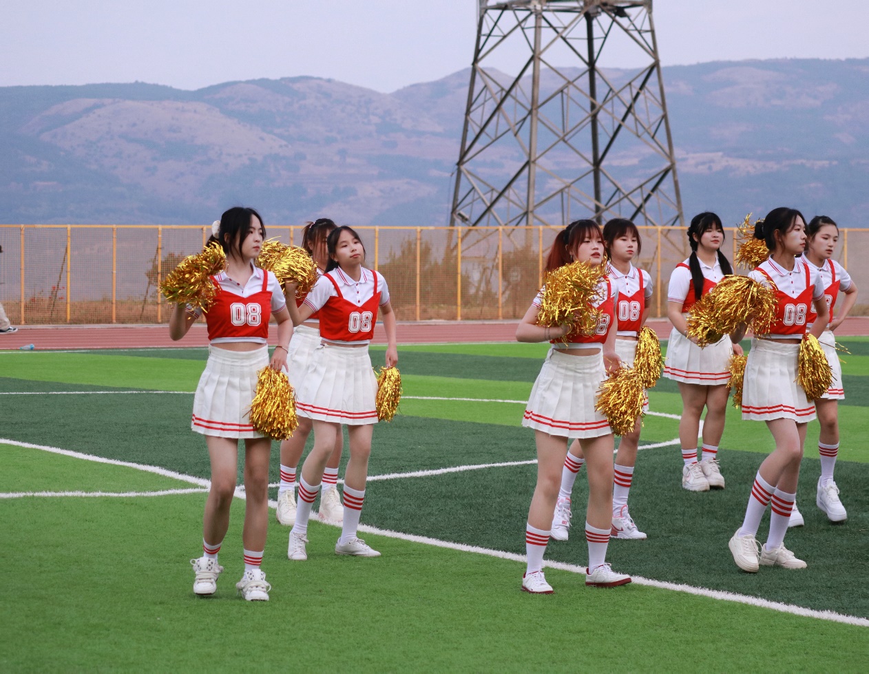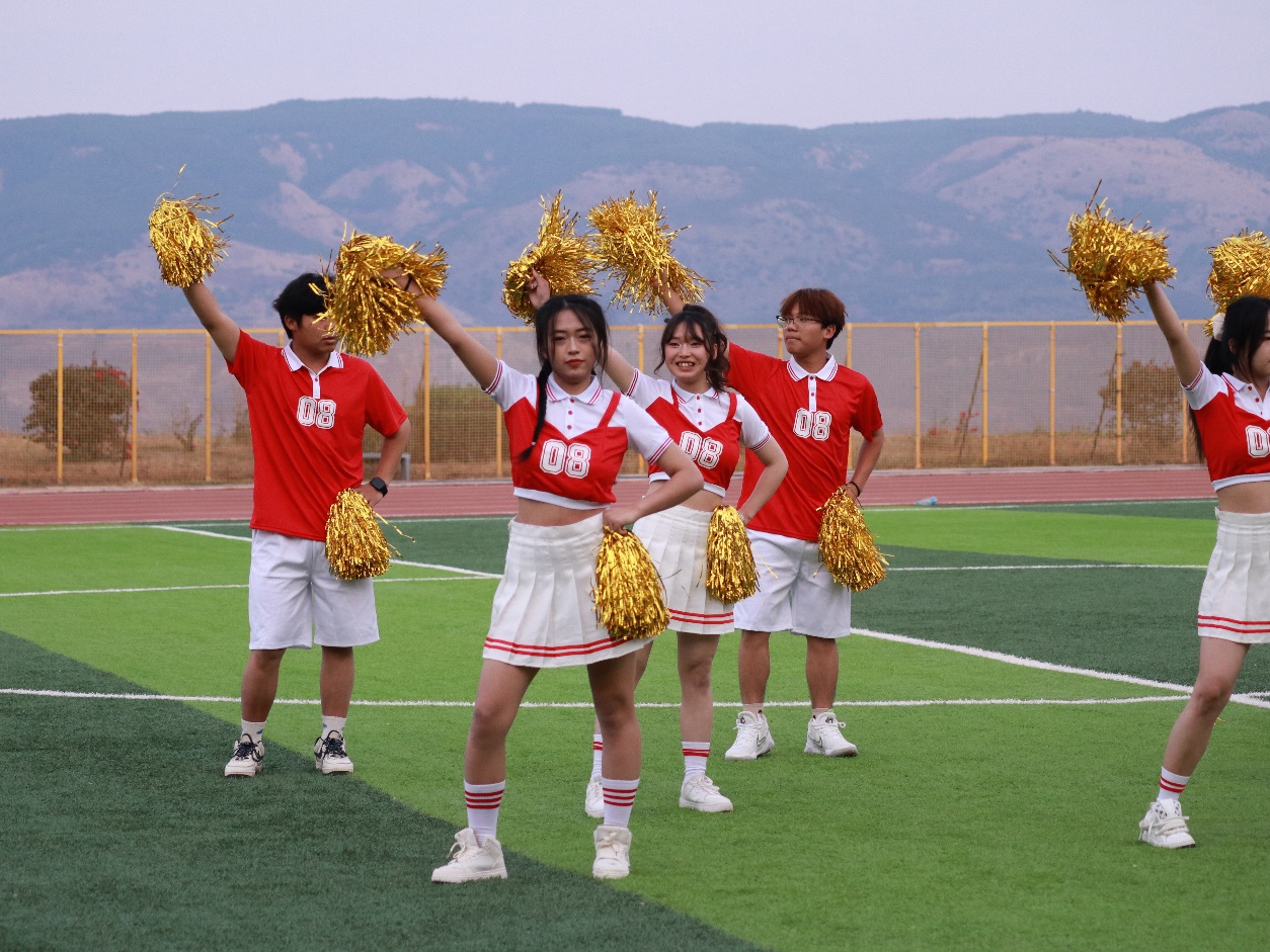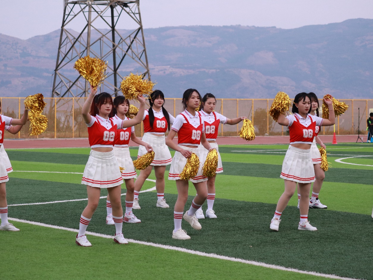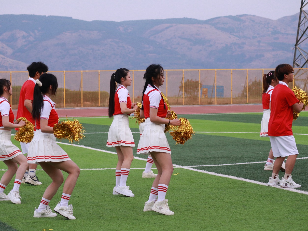 啦啦队队员们伴随着激昂轻快的音乐,身着鲜艳靓丽队服,以新颖别致的动作、矫健优美的舞姿、整齐划一的动作展示了大学生积极阳光、朝气蓬勃的良好风貌。
