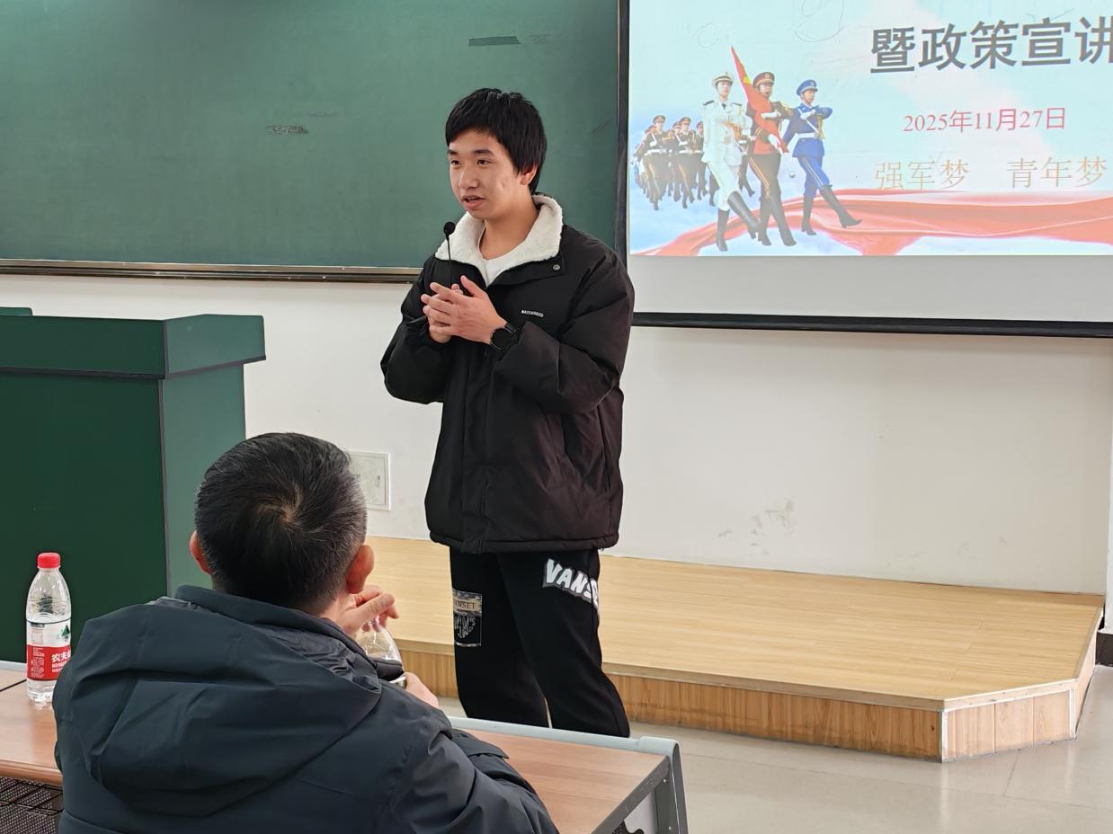 会上,李振副书记强调了应征入伍的重要意义,鼓励同学们积极响应号召、把握参军机遇。张颖书记结合学院往年升学与入伍数据,提出就业的三个方向(升学、入伍、进企业),同时,她重点解读了入伍政策的优势与发展前景,强调青年应在各自领域为民族复兴贡献力量,实现强军梦。