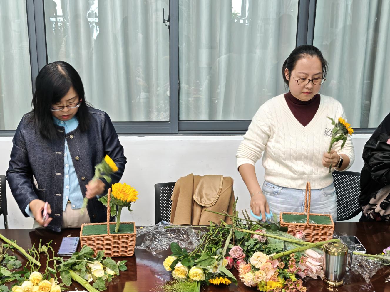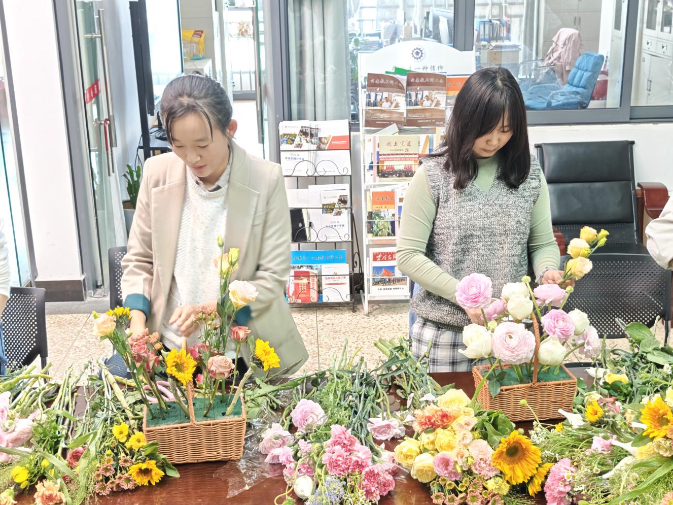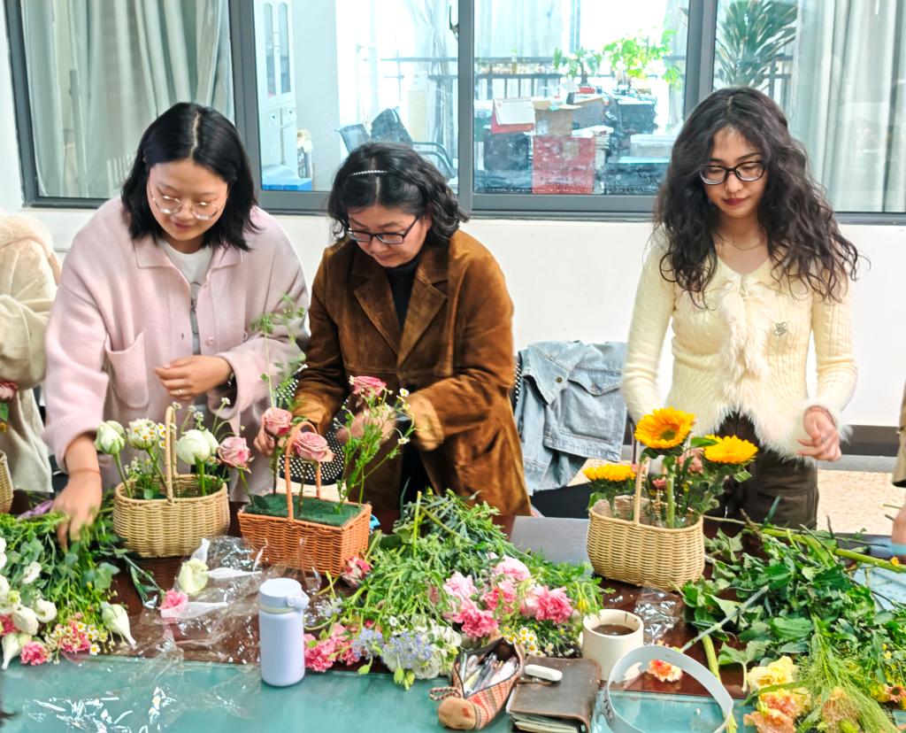 集体生日会后,学院还组织了插花活动。专业花艺师为大家讲解了插花艺术的基本知识、色彩搭配、造型技巧等,并现场演示了插花步骤。在花艺师的指导下,女教职工们发挥想象力和创造力,用心构思、精心搭配,将一朵朵鲜花错落有致地插入花篮中,制作出一个个独具匠心、赏心悦目的插花作品。活动现场花香四溢,充满着春天的气息,大家互相欣赏、交流插花心得,脸上洋溢着幸福的笑容。