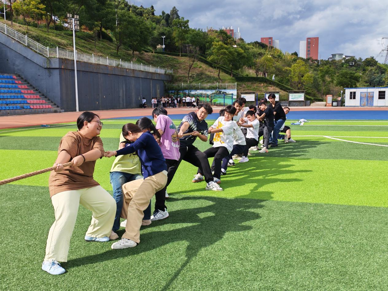 “一二!一二!”拔河比赛率先拉开帷幕。同学们分组紧握长绳、身体后倾,红绸带在双方之间来回“较劲”,口号声与呐喊声震彻赛场,点燃了全场的激情。随后的“两人三足”项目中,搭档们绑紧脚踝,从步履踉跄到默契同步,彼此搀扶鼓励,展现出团队间的信任与协作。压轴的“穿越呼啦圈”环节,大家手挽手、节奏一致,呼啦圈如流水般顺畅传递,阵阵笑声与欢呼成为秋日里最生动的注脚。