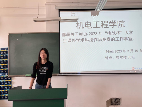 第三环节是对即将开展的“挑战杯”和“互联网+”创新创业大赛做动员工作。首先,主席团成员何大一同学对两项赛事的报名方式、作品内容等进行了介绍。随后,辅导员张洪梅老师进行了参赛动员,她希望全体团干部要在班级内主动宣传大赛、主动组队参加大赛,在大赛中提升自己、锻炼自己、成就自己。最后,学院团总支负责人陈立老师介绍了大赛的含金量和以往我院获得的优异成绩,并希望各团支部积极踊跃参加大赛,拿出好的作品参赛,再创佳绩。