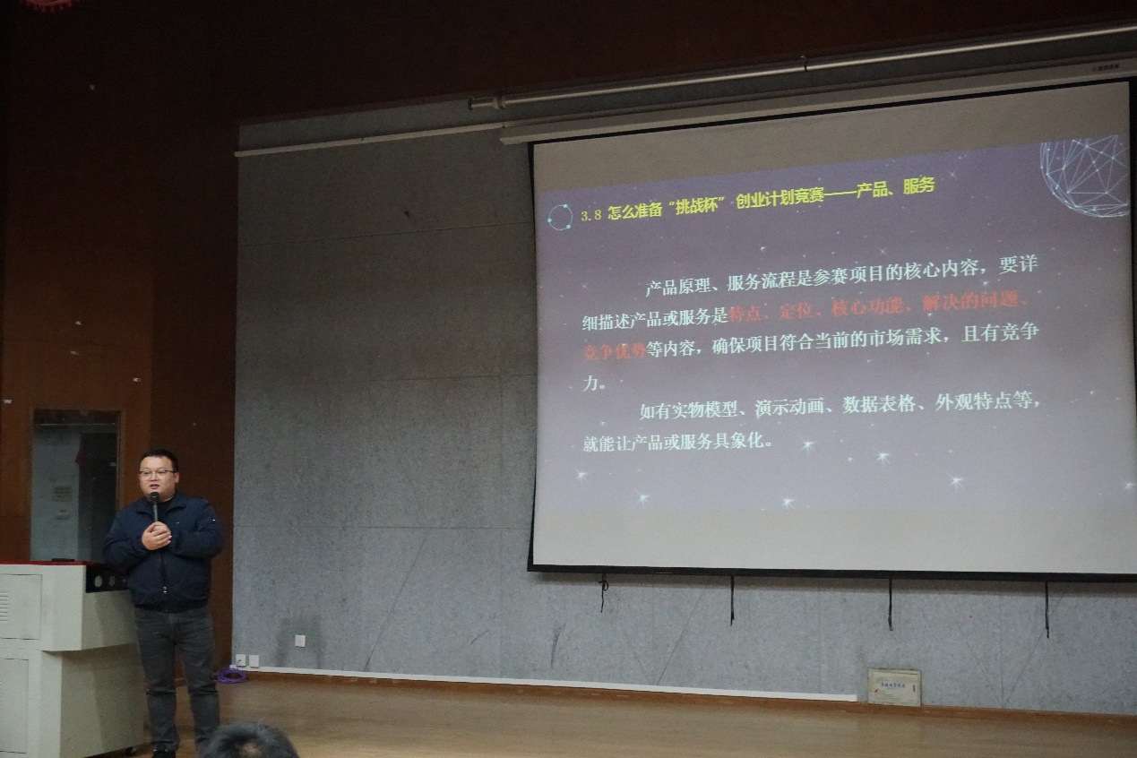 会议伊始,陈立老师从什么是“挑战杯”中国大学生创业计划竞赛为切入点,向大家讲解了参赛的重要性、参赛流程等要素,让同学们了解到参赛的基本方式、项目类型、参赛要素等。接着,陈立老师从怎么准备“挑战杯”竞赛角度讲述参赛选题、团队建设、竞争优势、团队的组建原则等,进一步向同学们梳理了参加比赛注意事项,让同学们认识到“挑战杯”竞赛的严谨性与专业性。最后,他强调,竞赛获奖的前提是合理的项目、高效的团队和用心地准备。希望大家尽快选好项目立意,联系指导老师,做好市场调查,提前做好准备。