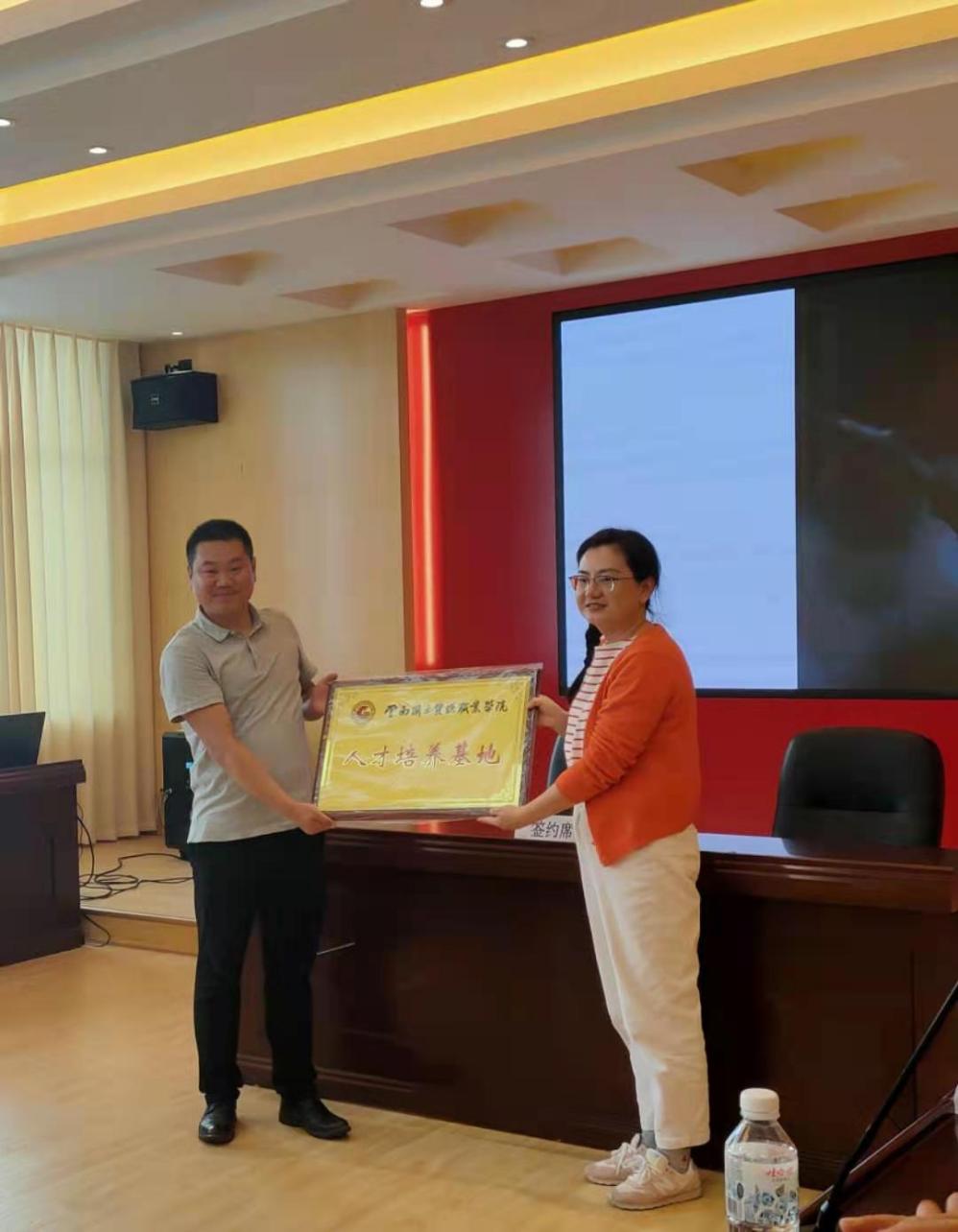 最后,就业合作处副处长钱敏代表学校与云南正宇智能科技有限公司总经理廖学一一同签订合作协议并授牌。