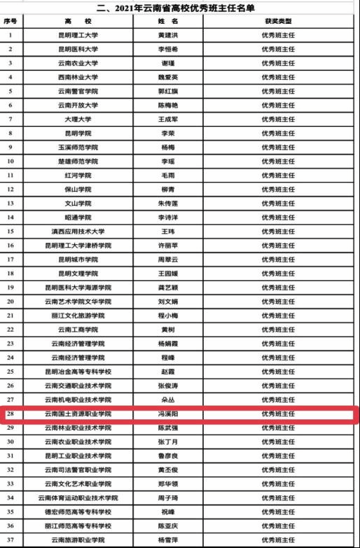 近日,中共云南省委教育工委公布了云南省2021年最美辅导员、最受学生敬佩辅导员、最关爱学生班主任名单,机电工程学院冯溪阳老师荣获2021年云南省优秀班主任称号。